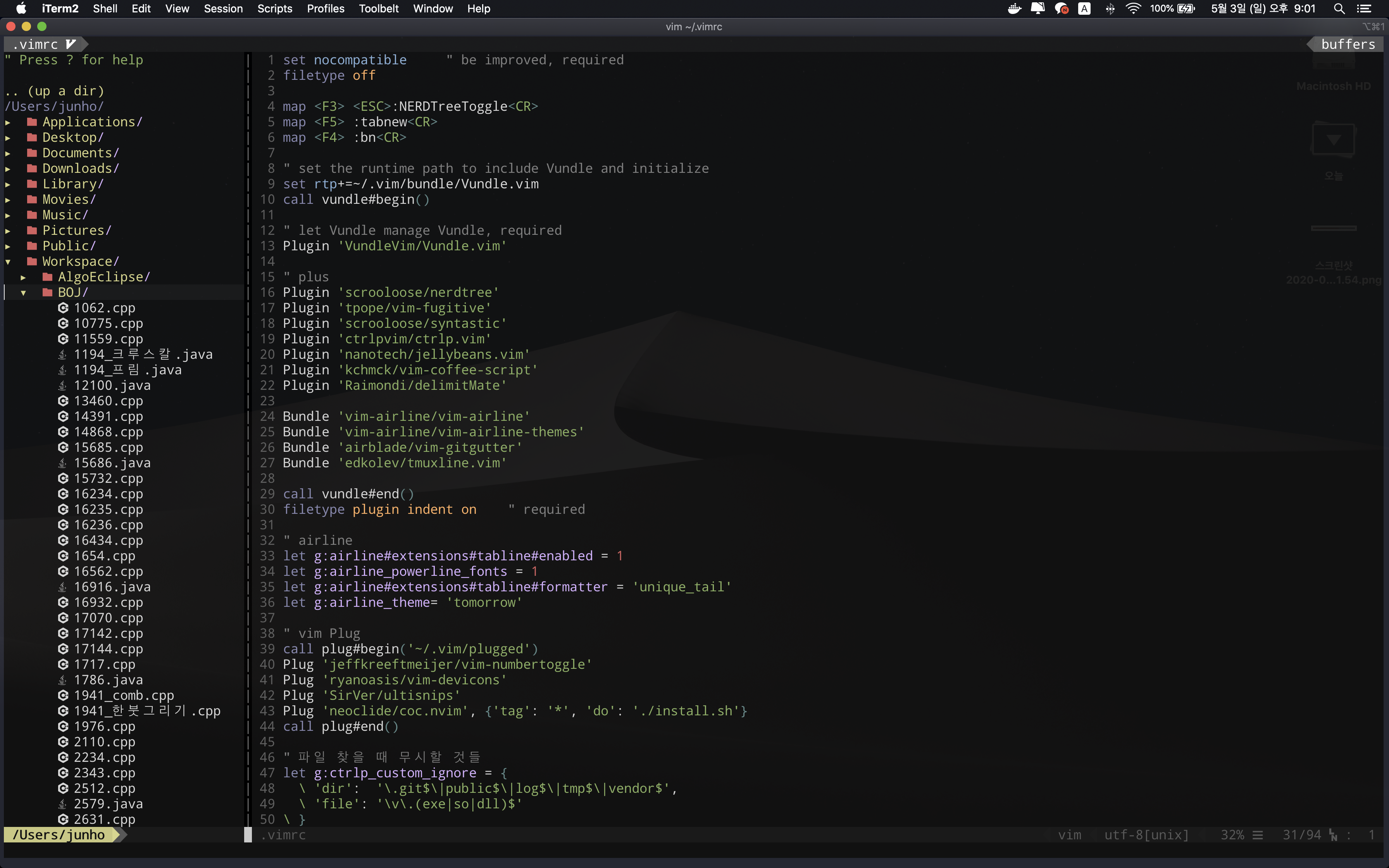 위 플러그인 기입 후 :source % :PluginInstall 을 차례대로 입력하면 왼쪽 파일 목록을 다음과 같이 확인 할 수 있습니다. 위 스크린샷과는 조금 다른 모습을 확인 할 수 있는데, 이 포스트를 끝까지 보신다면 위와 비슷한 형태지만 본인과 맞게 customizing 할 수 있을것입니다.